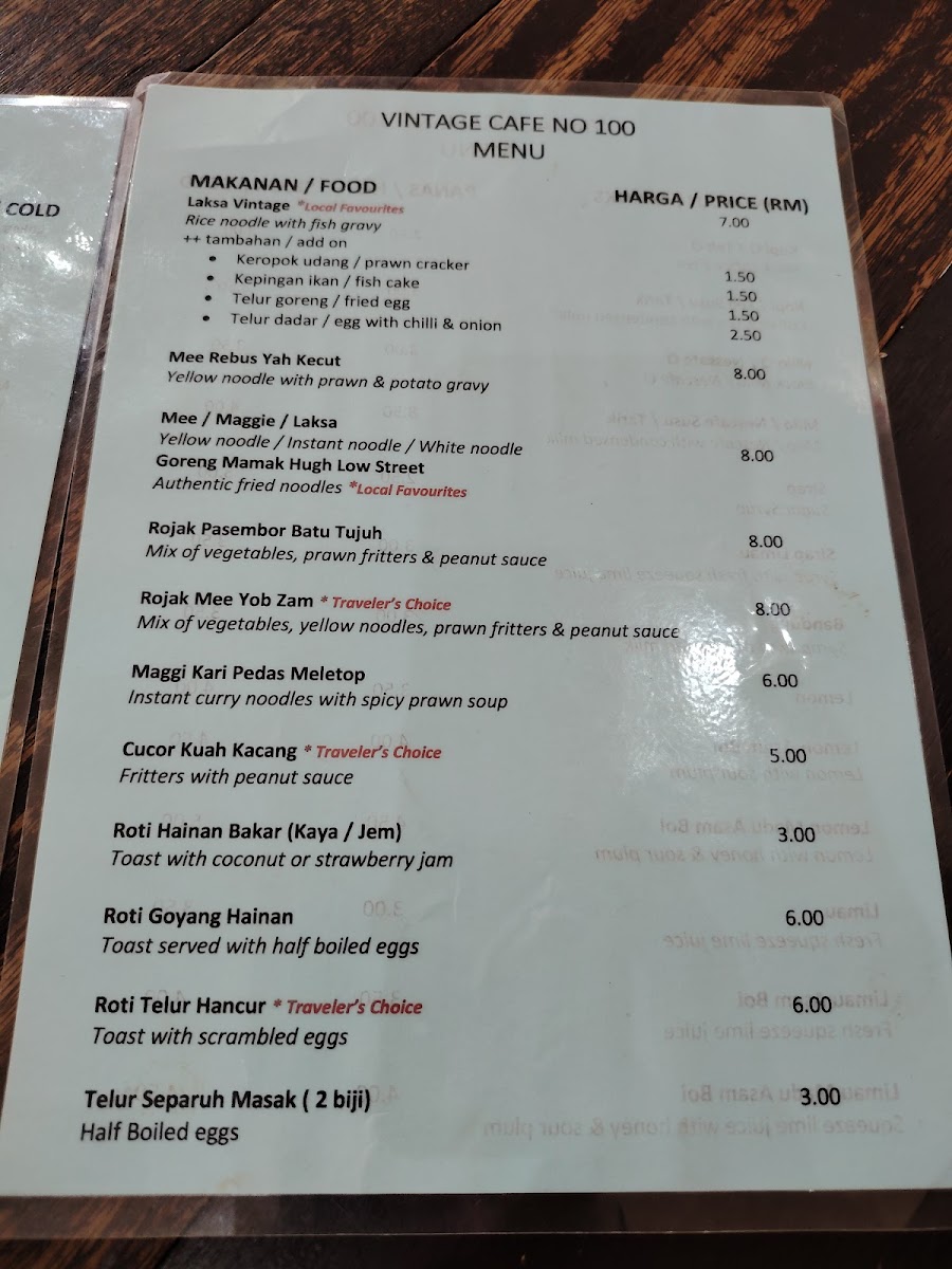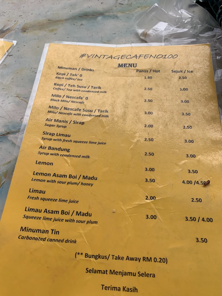 Vintage Cafe No100 Menu